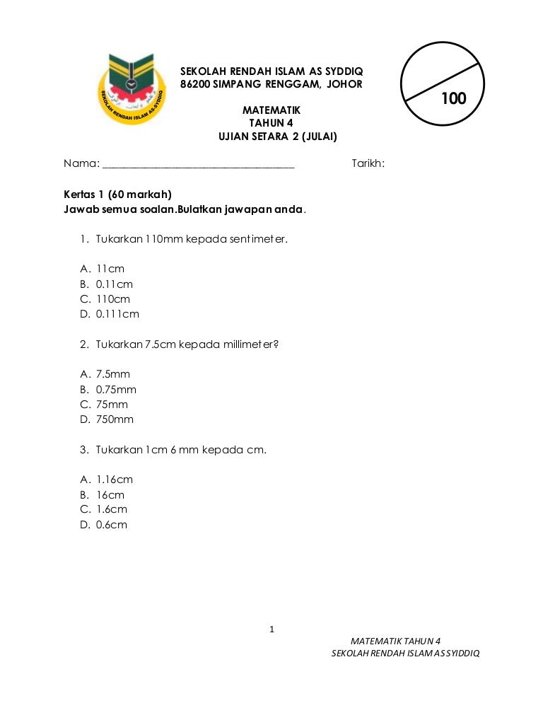 Ujian Matematik Tahun2 Kertas1 Mathematics Math 2 First Year